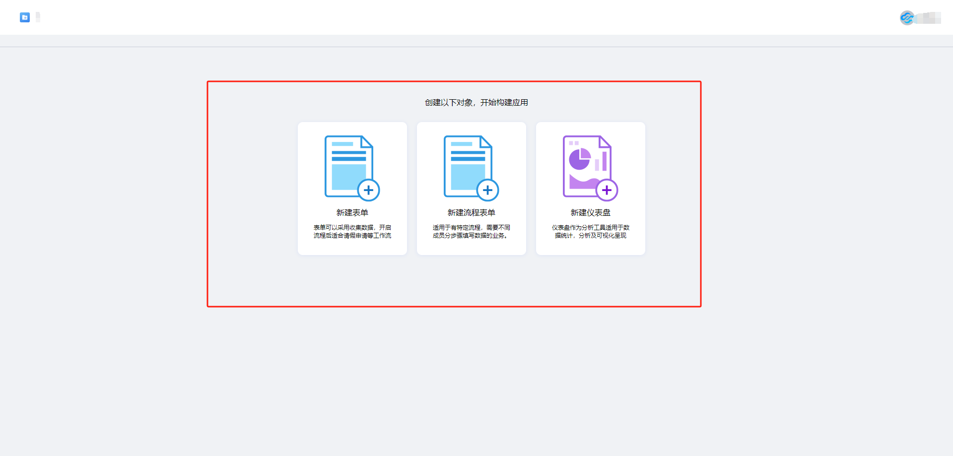 如果是空数据的应用,即应用中没有任何内容。表单、流程表单以及仪表盘的创建入口如下图所示:
