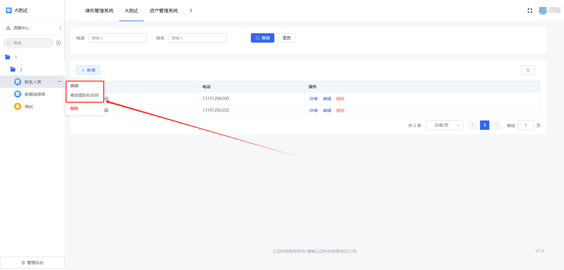 如需修改表单名称,可点击「表单后的设置按钮 >> 修改名称和图标 」,修改名称后点击「确定」即可: