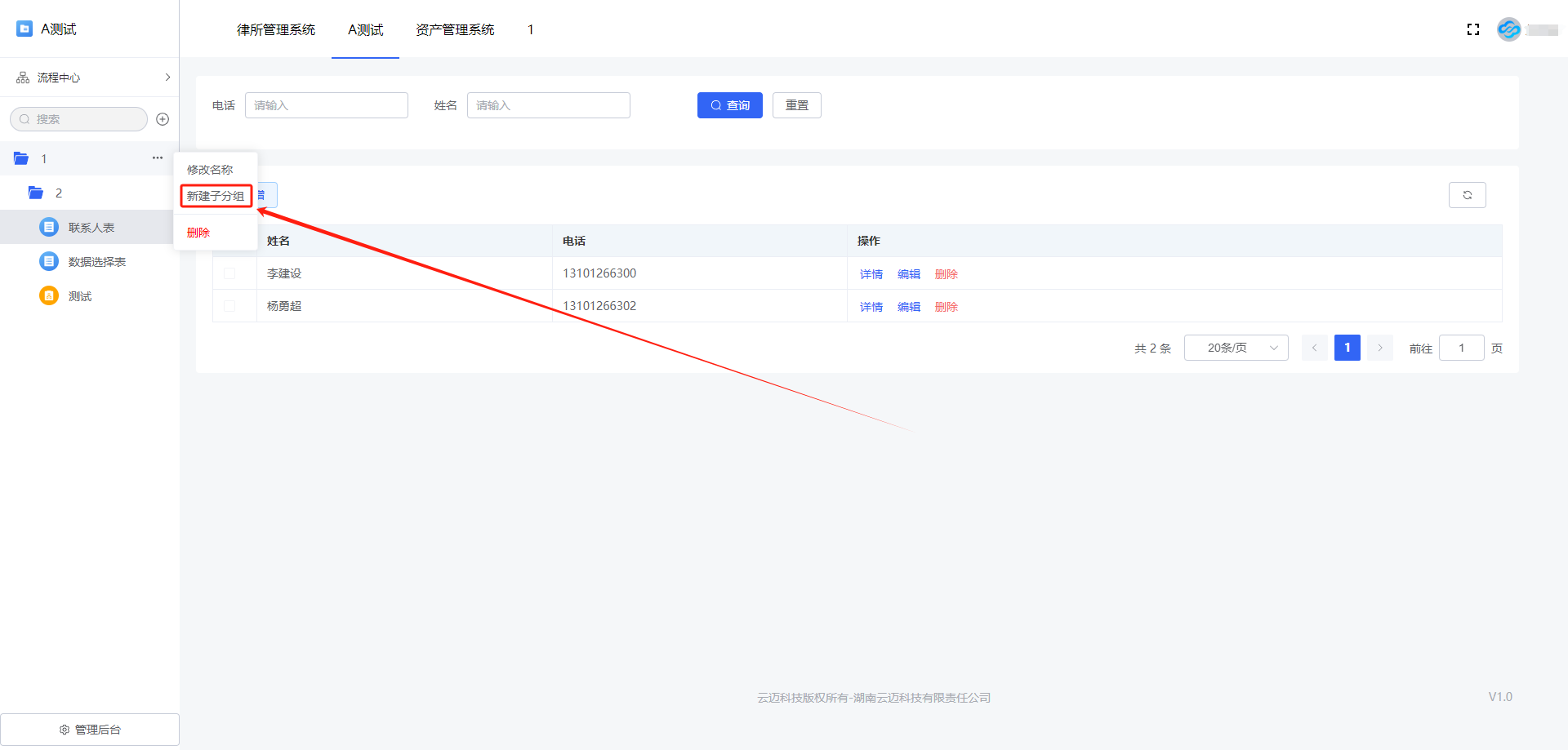 2) 新建子分组