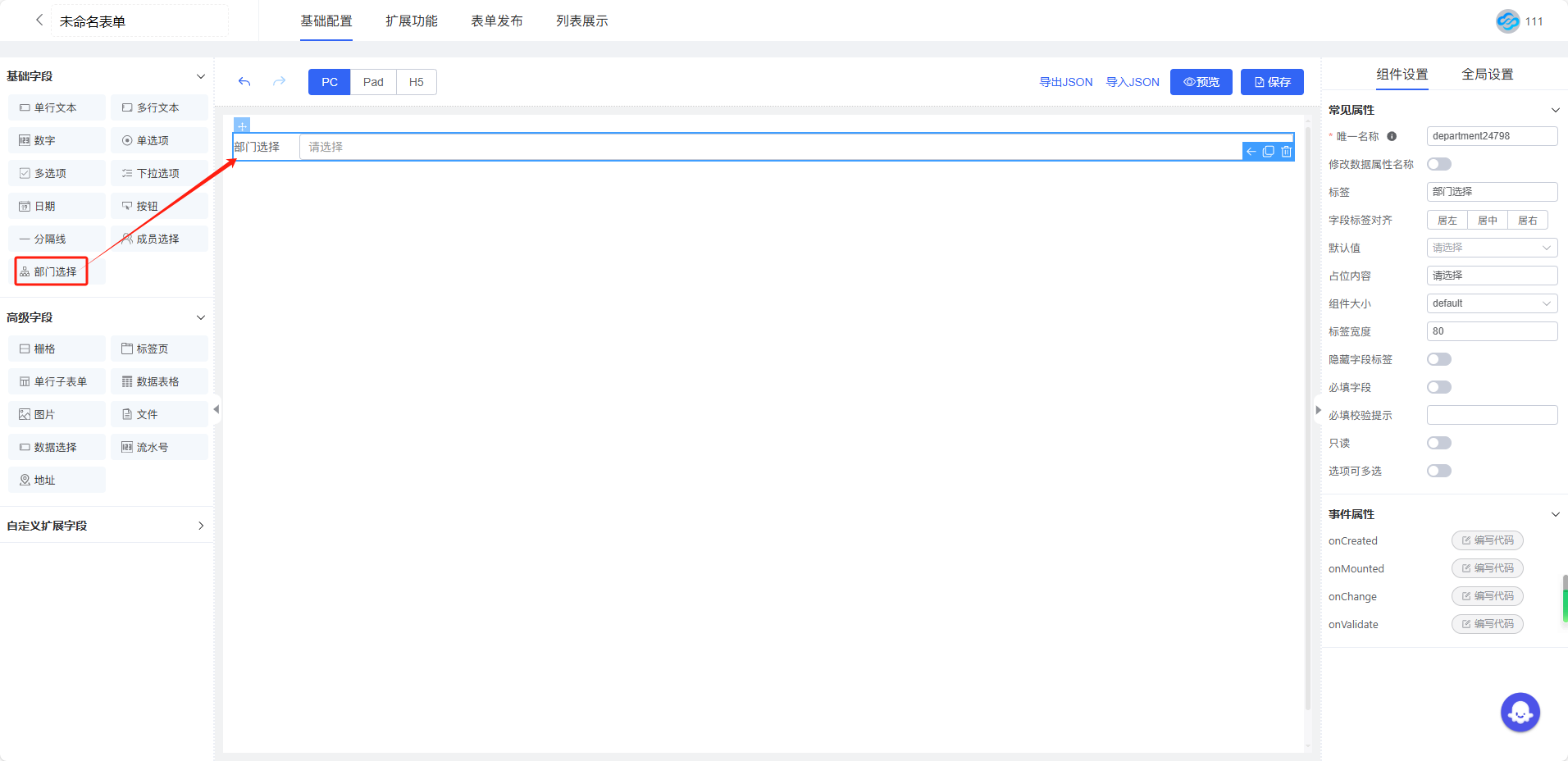 部门选择字段可以直接获取通讯录中的组织架构,包括部门单选和部门多选两个字段: