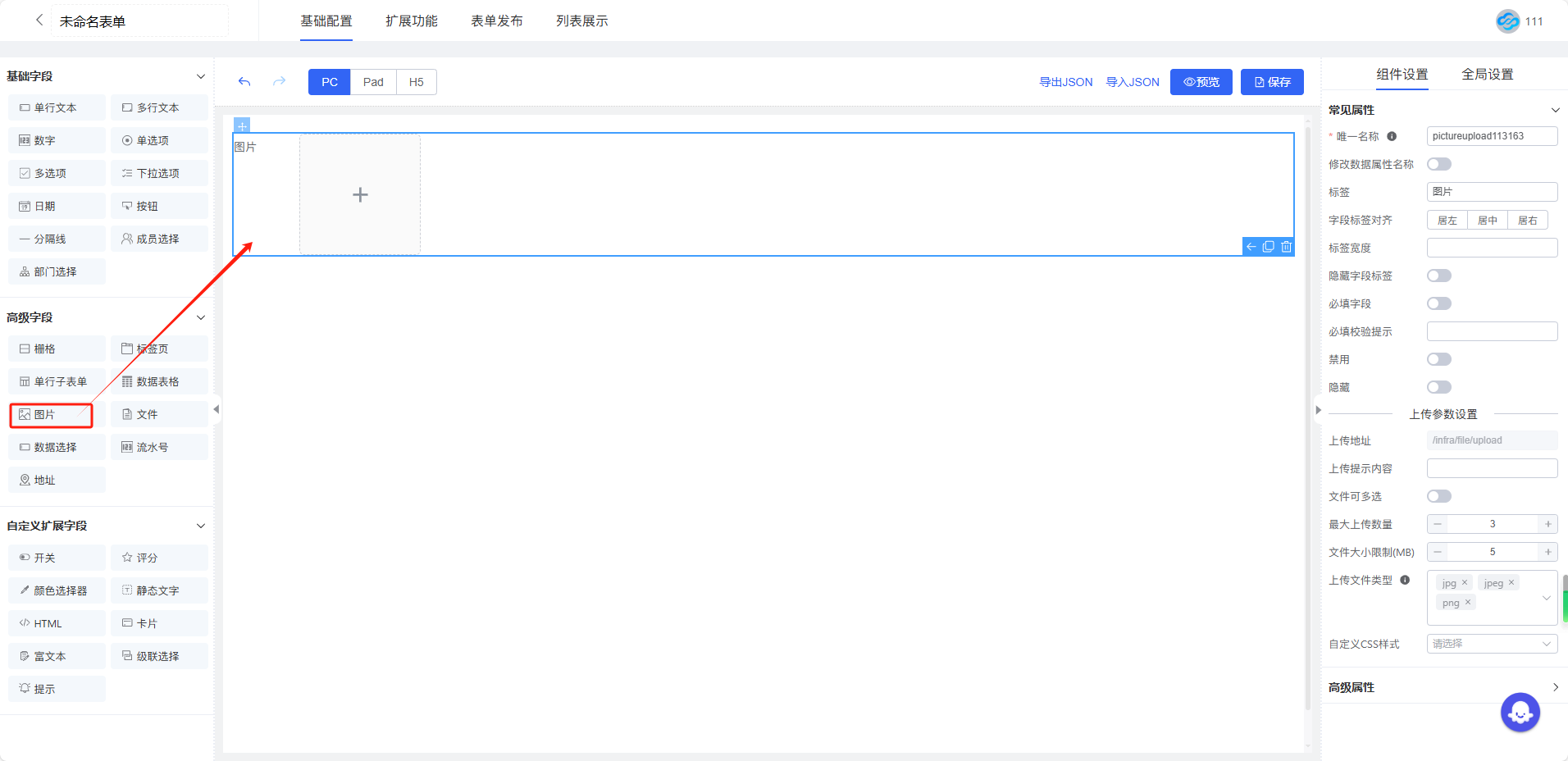 目录 搜索 展开 极速搭PC端用户手册1.注册登录2.工作台介绍3.应用中心4.功能步骤介绍5.快速搭建应用6.智能助手7.邀请成员及团队切换极速搭产品功能详细介绍表单设计字段基础字段单行输入多行输入计数器单选项多选项下拉选项日期按钮分割线成员选择部门选择高级字段栅格标签页单行子表单数据表格图片文件数据选择流水号地址自定义扩展字段开关评分颜色选择器静态文本HTML卡片富文本级联选择提示通讯录管理内部组织部门组织结构成员管理角色管理员角色流程设计流程节点设计节点属性设置流程审批人抄送操作权限节点权限流程属性设置流程提醒流程状态和流程图流程使用仪表盘仪表盘入门仪表盘制作流程仪表盘界面介绍仪表盘基础设置仪表盘数据源如何选择正确的图表工作台应用后台(高级功能)数据工厂数据工厂入门数据流数据流节点详解输入输出横向连接追加合并分组汇总数据筛选字段设置排名累加汇总(求累计值)行转列去重输出表的使用应用使用手册工单管理(轻量化)进销存(无库存版)常见问题 暂无相关搜索结果! 阅读次数:430 本文档使用 MinDoc 发布 图片 图片1.功能简介图片字段专门用来上传图片信息,支持上传的图片格式包括:jpg、jpeg、png、gif。2.应用场景· 产品管理:通过图片字段录入产品的图片信息;· 设备维修管理:通过图片字段收集设备故障具体情况;· 企业管理报销:通过图片字段收集发票信息等。3.预期效果在 PC 端上传图片时,支持从文件中选择、拖拽、粘贴或手机扫码,效果如下:作者:极速搭 创建时间:2024-11-14 16:17最后编辑:极速搭 更新时间:2025-07-11 10:08 提交评论