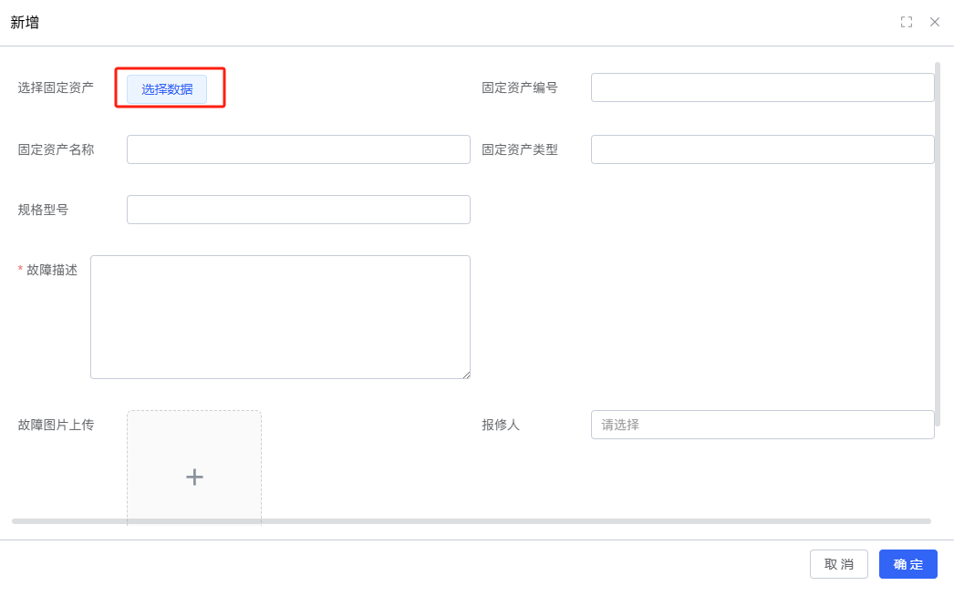填写固定资产报修表单时,可通过「选择数据」字段选择「固定资产领用」表的数据,并调取到当前表单中