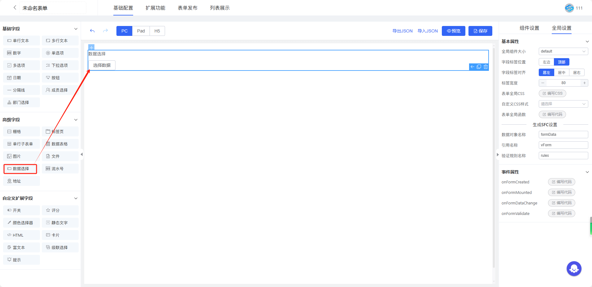 数据选择是指在当前表单中调取出本表、或其他表单的已有数据,并可跟随当前数据一同入库,可以理解为功能更强的数据联动。