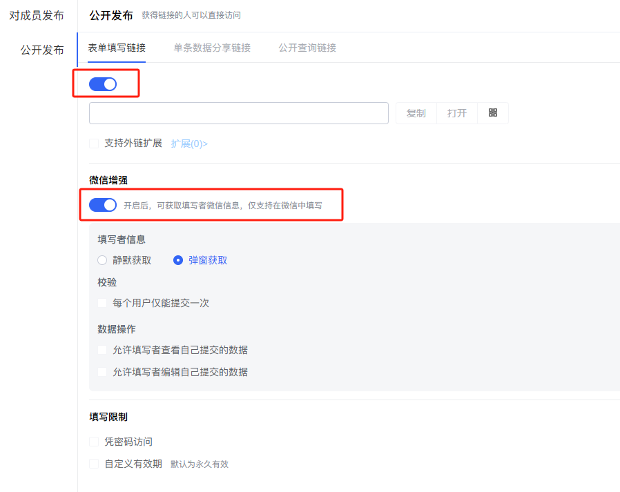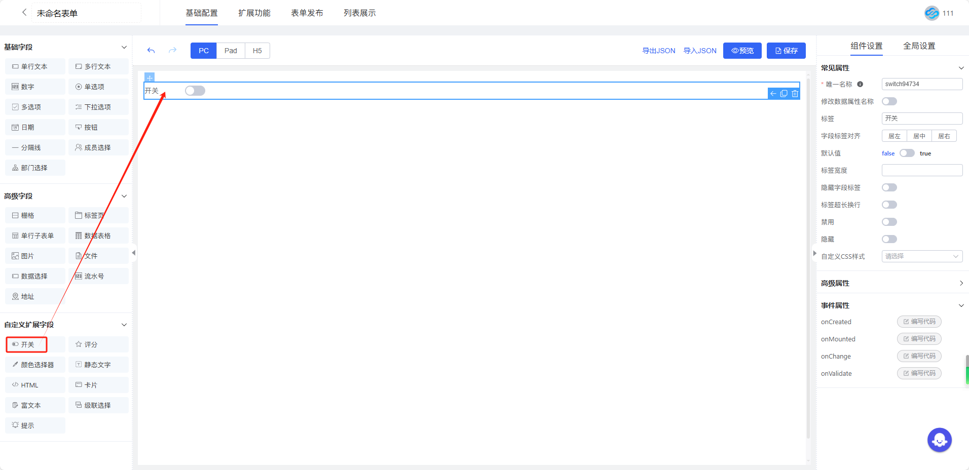 目录 搜索 展开 极速搭PC端用户手册1.注册登录2.工作台介绍3.应用中心4.功能步骤介绍5.快速搭建应用6.智能助手7.邀请成员及团队切换极速搭产品功能详细介绍表单设计字段基础字段单行输入多行输入计数器单选项多选项下拉选项日期按钮分割线成员选择部门选择高级字段栅格标签页单行子表单数据表格图片文件数据选择流水号地址自定义扩展字段开关评分颜色选择器静态文本HTML卡片富文本级联选择提示通讯录管理内部组织部门组织结构成员管理角色管理员角色流程设计流程节点设计节点属性设置流程审批人抄送操作权限节点权限流程属性设置流程提醒流程状态和流程图流程使用仪表盘仪表盘入门仪表盘制作流程仪表盘界面介绍仪表盘基础设置仪表盘数据源如何选择正确的图表工作台应用后台(高级功能)数据工厂数据工厂入门数据流数据流节点详解输入输出横向连接追加合并分组汇总数据筛选字段设置排名累加汇总(求累计值)行转列去重输出表的使用应用使用手册工单管理(轻量化)进销存(无库存版)常见问题 暂无相关搜索结果! 阅读次数:401 本文档使用 MinDoc 发布 开关 开关1.功能简介开关通常用于表示二元状态(开/关、打开/关闭、启用/禁用)可通过配色、标签等方式进行自定义,以满足不同应用场景的需要。2.应用场景· 企业审批:通过开关简化审批流程;禁用或启用设置管理权限;· 问卷调研场景:通过开关字段优化问卷样式,用于单选。3.预期效果开关预期效果以成员协作【显示/隐藏】为例如下:作者:极速搭 创建时间:2024-11-14 16:18最后编辑:极速搭 更新时间:2025-07-11 10:08 提交评论