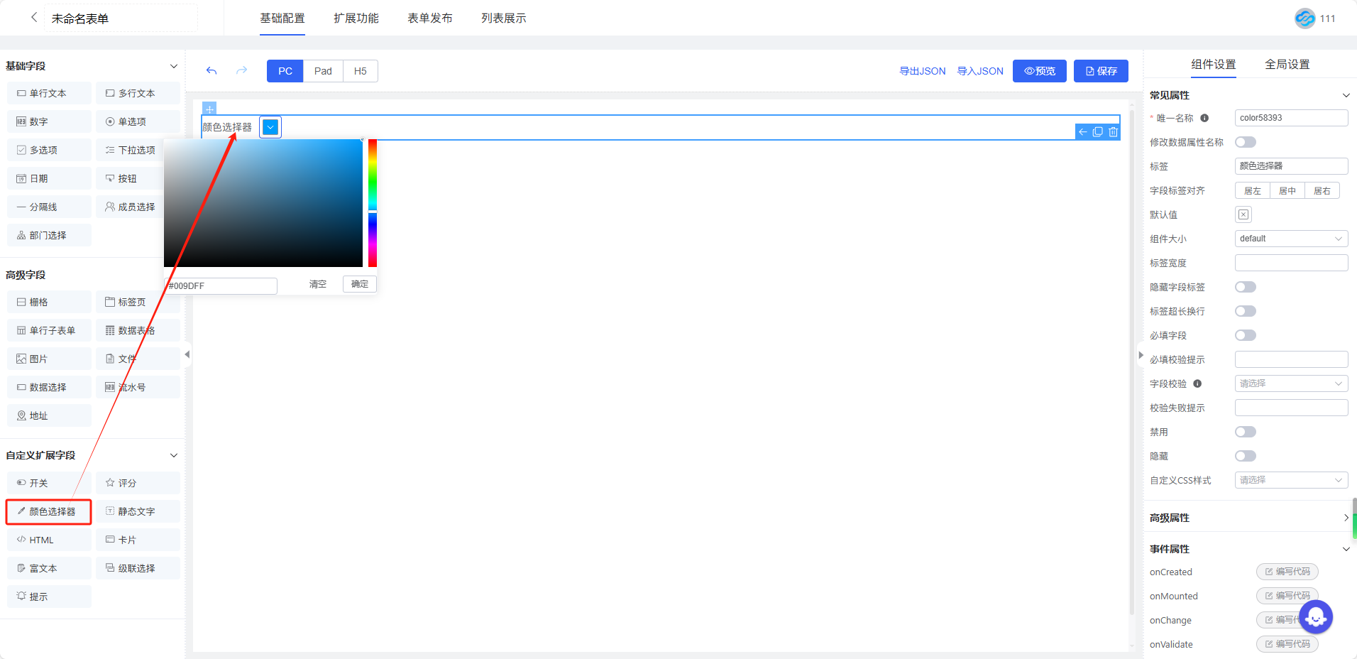 目录 搜索 展开 极速搭PC端用户手册1.注册登录2.工作台介绍3.应用中心4.功能步骤介绍5.快速搭建应用6.智能助手7.邀请成员及团队切换极速搭产品功能详细介绍表单设计字段基础字段单行输入多行输入计数器单选项多选项下拉选项日期按钮分割线成员选择部门选择高级字段栅格标签页单行子表单数据表格图片文件数据选择流水号地址自定义扩展字段开关评分颜色选择器静态文本HTML卡片富文本级联选择提示通讯录管理内部组织部门组织结构成员管理角色管理员角色流程设计流程节点设计节点属性设置流程审批人抄送操作权限节点权限流程属性设置流程提醒流程状态和流程图流程使用仪表盘仪表盘入门仪表盘制作流程仪表盘界面介绍仪表盘基础设置仪表盘数据源如何选择正确的图表工作台应用后台(高级功能)数据工厂数据工厂入门数据流数据流节点详解输入输出横向连接追加合并分组汇总数据筛选字段设置排名累加汇总(求累计值)行转列去重输出表的使用应用使用手册工单管理(轻量化)进销存(无库存版)常见问题 暂无相关搜索结果! 阅读次数:442 本文档使用 MinDoc 发布 颜色选择器 颜色选择器1.功能简介颜色选择器具备颜色吸管功能,可以在屏幕上的任意位置选择一种颜色。可以根据需要选择合适的颜色模式和调色板,满足自定义设计功能。2.应用场景· 调研系统:通过颜色选择器设置选项,便于区分各项,提高效率。· 人事行政管理:通过颜色选择器设置考勤、考核,自定义设计表单。作者:极速搭 创建时间:2024-11-14 16:18最后编辑:极速搭 更新时间:2025-07-11 10:08 提交评论
