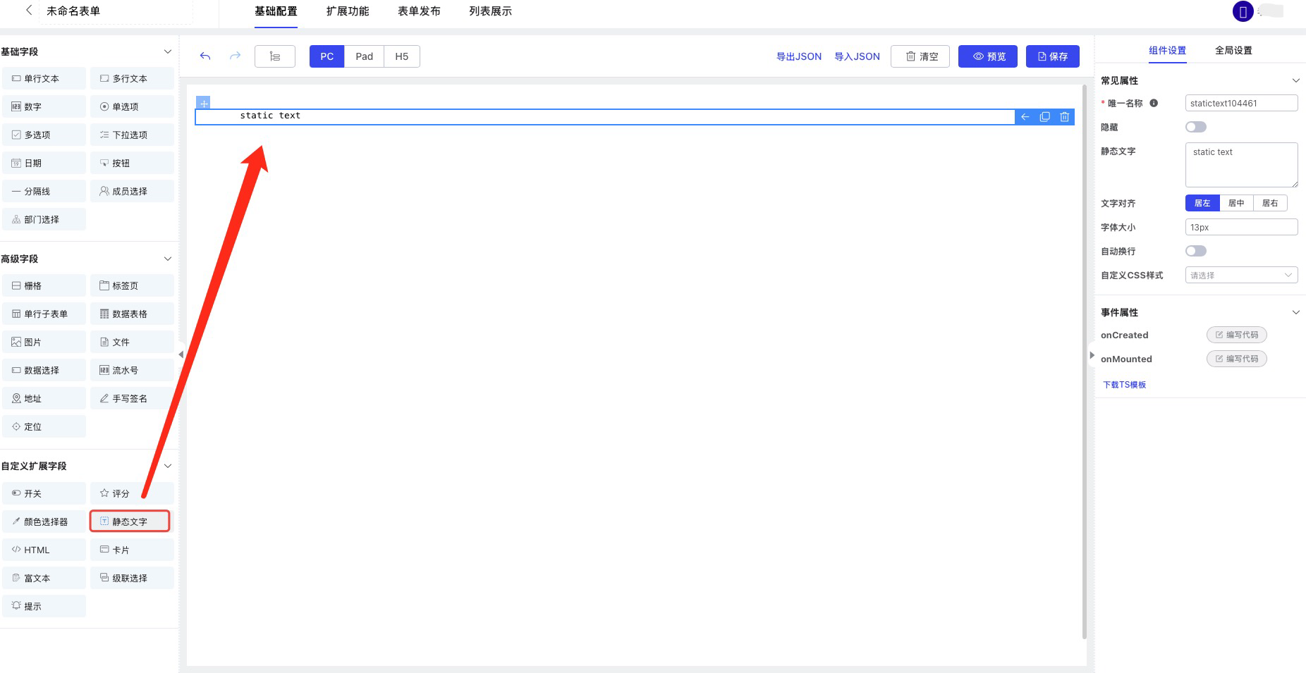 目录 搜索 展开 极速搭PC端用户手册1.注册登录2.工作台介绍3.应用中心4.功能步骤介绍5.快速搭建应用6.智能助手7.邀请成员及团队切换极速搭产品功能详细介绍表单设计字段基础字段单行输入多行输入计数器单选项多选项下拉选项日期按钮分割线成员选择部门选择高级字段栅格标签页单行子表单数据表格图片文件数据选择流水号地址自定义扩展字段开关评分颜色选择器静态文本HTML卡片富文本级联选择提示通讯录管理内部组织部门组织结构成员管理角色管理员角色流程设计流程节点设计节点属性设置流程审批人抄送操作权限节点权限流程属性设置流程提醒流程状态和流程图流程使用仪表盘仪表盘入门仪表盘制作流程仪表盘界面介绍仪表盘基础设置仪表盘数据源如何选择正确的图表工作台应用后台(高级功能)数据工厂数据工厂入门数据流数据流节点详解输入输出横向连接追加合并分组汇总数据筛选字段设置排名累加汇总(求累计值)行转列去重输出表的使用应用使用手册工单管理(轻量化)进销存(无库存版)常见问题 暂无相关搜索结果! 阅读次数:391 本文档使用 MinDoc 发布 静态文本 静态文本1.功能简介静态文本指内容固定不变,不会随用户操作、时间或外部数据变化而动态更新的文本形式。2.应用场景标题、段落正文、版权信息作者:极速搭 创建时间:2024-11-14 16:18最后编辑:极速搭 更新时间:2025-10-15 14:21 提交评论