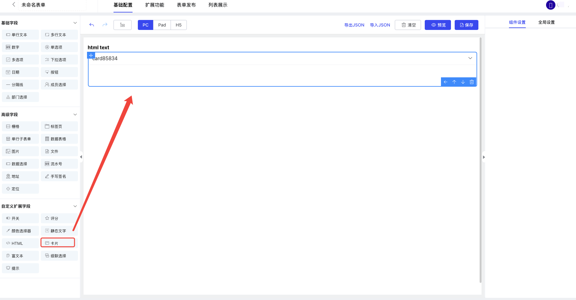 目录 搜索 展开 极速搭PC端用户手册1.注册登录2.工作台介绍3.应用中心4.功能步骤介绍5.快速搭建应用6.智能助手7.邀请成员及团队切换极速搭产品功能详细介绍表单设计字段基础字段单行输入多行输入计数器单选项多选项下拉选项日期按钮分割线成员选择部门选择高级字段栅格标签页单行子表单数据表格图片文件数据选择流水号地址自定义扩展字段开关评分颜色选择器静态文本HTML卡片富文本级联选择提示通讯录管理内部组织部门组织结构成员管理角色管理员角色流程设计流程节点设计节点属性设置流程审批人抄送操作权限节点权限流程属性设置流程提醒流程状态和流程图流程使用仪表盘仪表盘入门仪表盘制作流程仪表盘界面介绍仪表盘基础设置仪表盘数据源如何选择正确的图表工作台应用后台(高级功能)数据工厂数据工厂入门数据流数据流节点详解输入输出横向连接追加合并分组汇总数据筛选字段设置排名累加汇总(求累计值)行转列去重输出表的使用应用使用手册工单管理(轻量化)进销存(无库存版)常见问题 暂无相关搜索结果! 阅读次数:395 本文档使用 MinDoc 发布 卡片 卡片1.功能简介卡片通常是一个用于显示信息和内容的矩形容器的字段。用于创建可视化的布局,以显示相关的文本、图像、按钮或其他交互元素,元素的组合可以根据具体设计的需求而有所不同,以创造出功能丰富、美观并易于理解的卡片布局。作者:极速搭 创建时间:2024-11-14 16:19最后编辑:极速搭 更新时间:2025-10-15 14:24 提交评论