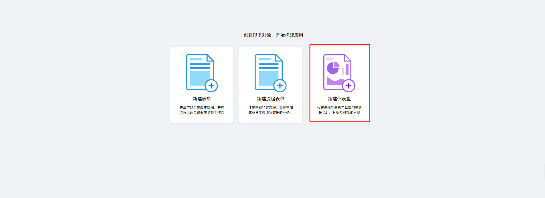 仪表盘一般是对应用已有的表单、数据工厂、聚合表等数据进行分析统计。需要新建仪表盘进行分析统计的入口如下图所示: