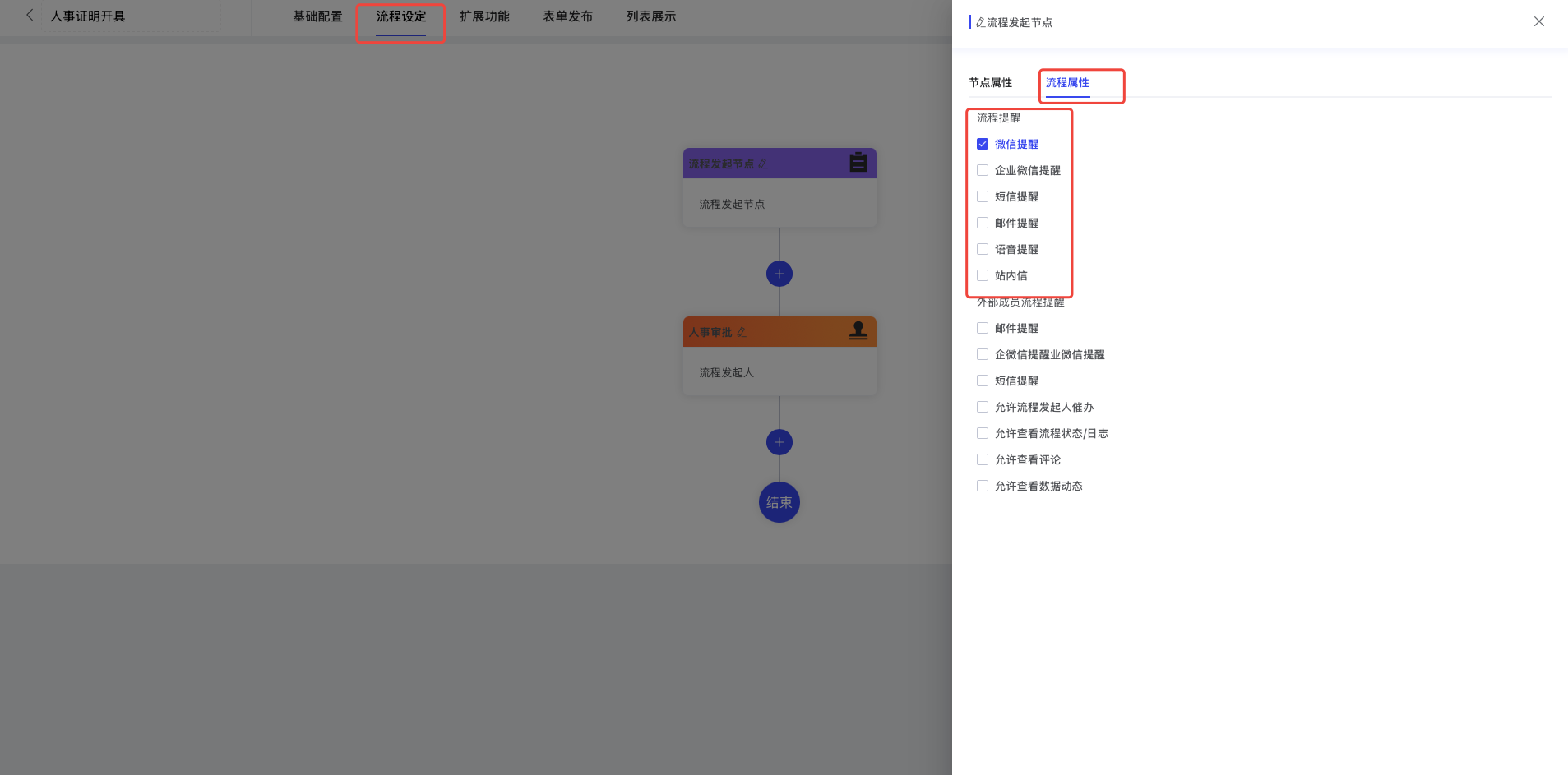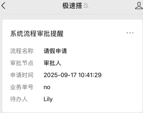 目录 搜索 展开 极速搭PC端用户手册1.注册登录2.工作台介绍3.应用中心4.功能步骤介绍5.快速搭建应用6.智能助手7.邀请成员及团队切换极速搭产品功能详细介绍表单设计字段基础字段单行输入多行输入计数器单选项多选项下拉选项日期按钮分割线成员选择部门选择高级字段栅格标签页单行子表单数据表格图片文件数据选择流水号地址自定义扩展字段开关评分颜色选择器静态文本HTML卡片富文本级联选择提示通讯录管理内部组织部门组织结构成员管理角色管理员角色流程设计流程节点设计节点属性设置流程审批人抄送操作权限节点权限流程属性设置流程提醒流程状态和流程图流程使用仪表盘仪表盘入门仪表盘制作流程仪表盘界面介绍仪表盘基础设置仪表盘数据源如何选择正确的图表工作台应用后台(高级功能)数据工厂数据工厂入门数据流数据流节点详解输入输出横向连接追加合并分组汇总数据筛选字段设置排名累加汇总(求累计值)行转列去重输出表的使用应用使用手册工单管理(轻量化)进销存(无库存版)常见问题 暂无相关搜索结果! 阅读次数:358 本文档使用 MinDoc 发布 流程提醒 流程提醒1.简介1.1功能简介流程提醒指的是,当流程到达流程节点时,给流程负责人、抄送人发送消息提醒。1.2应用场景提醒流程节点负责人及时审批处理流程;提醒节点抄送人查看流程处理结果与进度;对 催办 的流程数据进行提醒等1.3效果展示2.设置方法2.1设置入口进入流程表单的[流程设定 - 流程属性],即可勾选相应的流程提醒:作者:极速搭 创建时间:2024-11-18 11:59最后编辑:极速搭 更新时间:2025-09-29 17:16 提交评论
