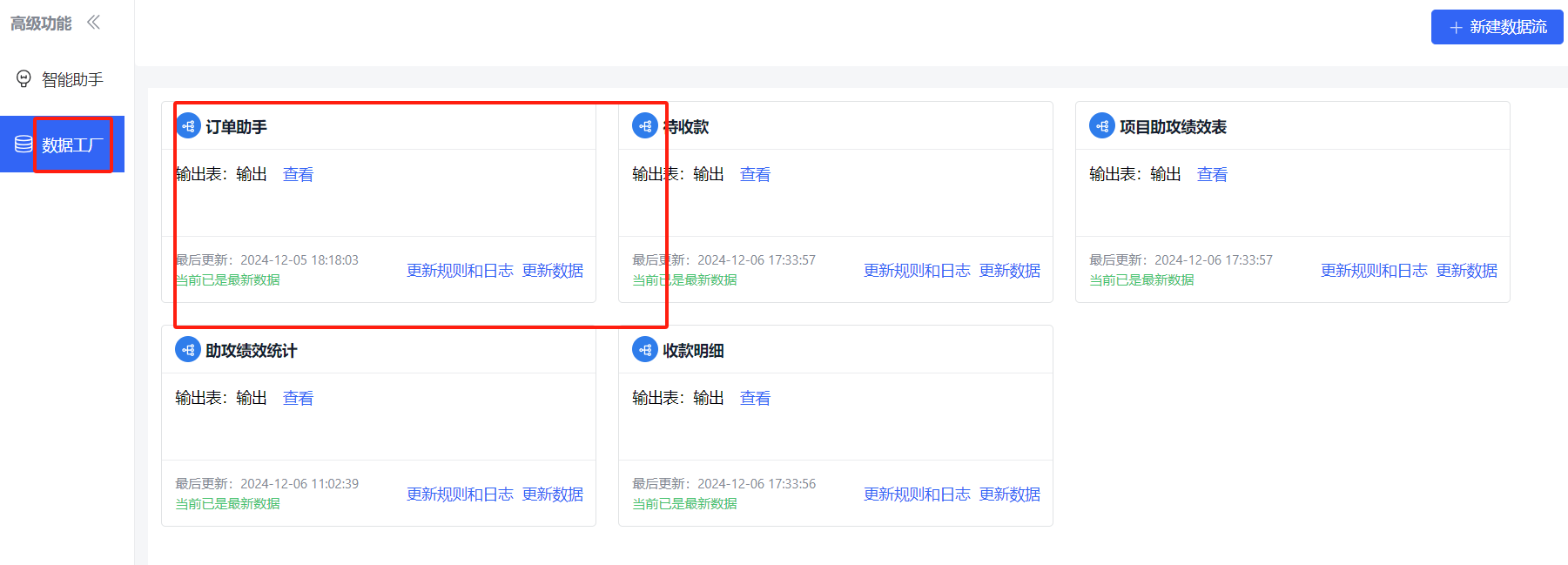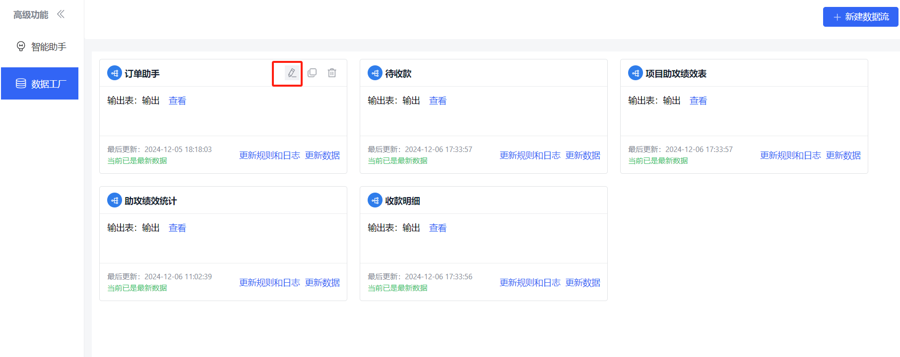 访问数据工厂功能界面,界面上的小卡片均代表一个数据流。如下图所示: