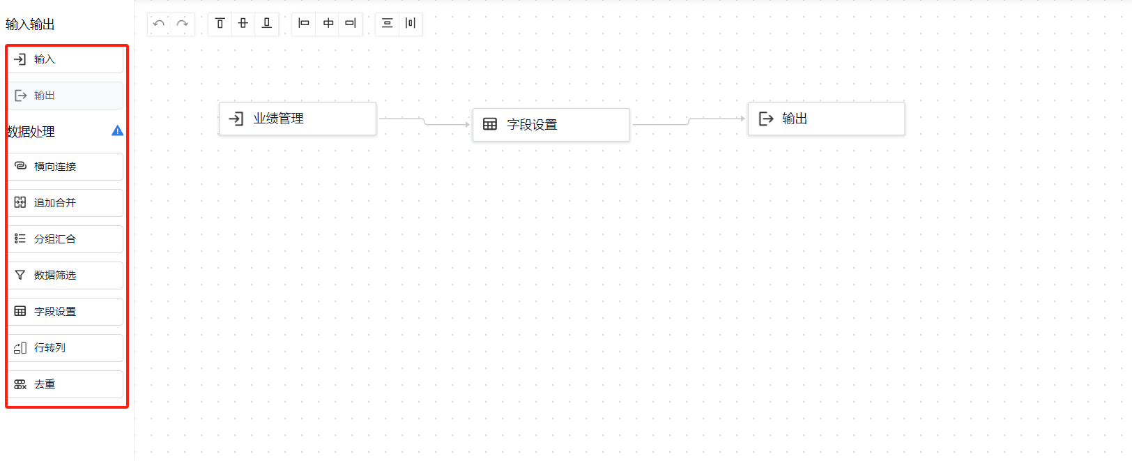 选择需要对齐的数据流节点(至少 2 个节点),选择工具栏的「对齐方式」即可对节点进行对齐设置。