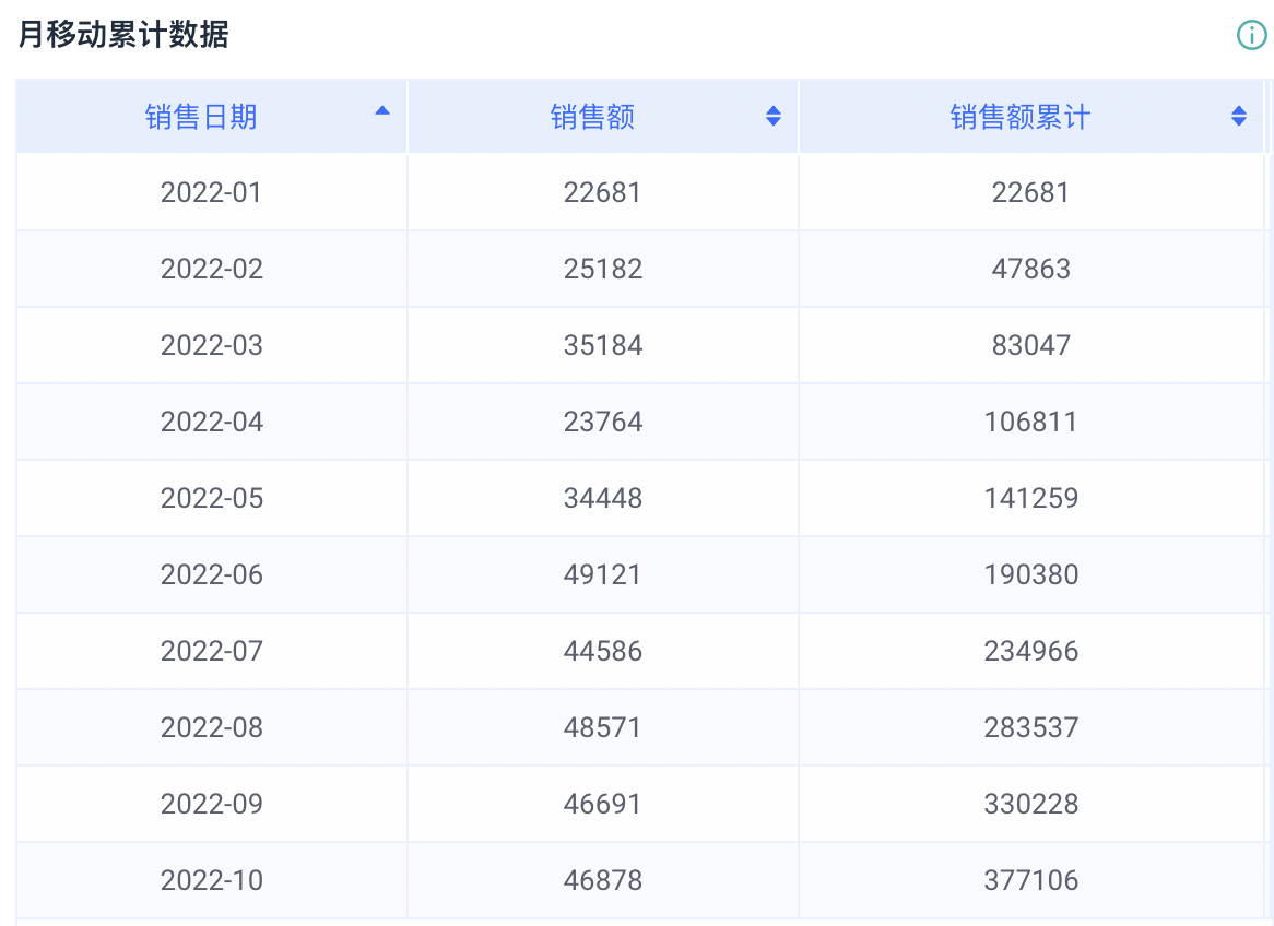 在无分组的情况下,将数据按照设置的顺序全量累加汇总。如,根据销售时间,对销售额累加汇总,及时了解各个时间段的销售总额