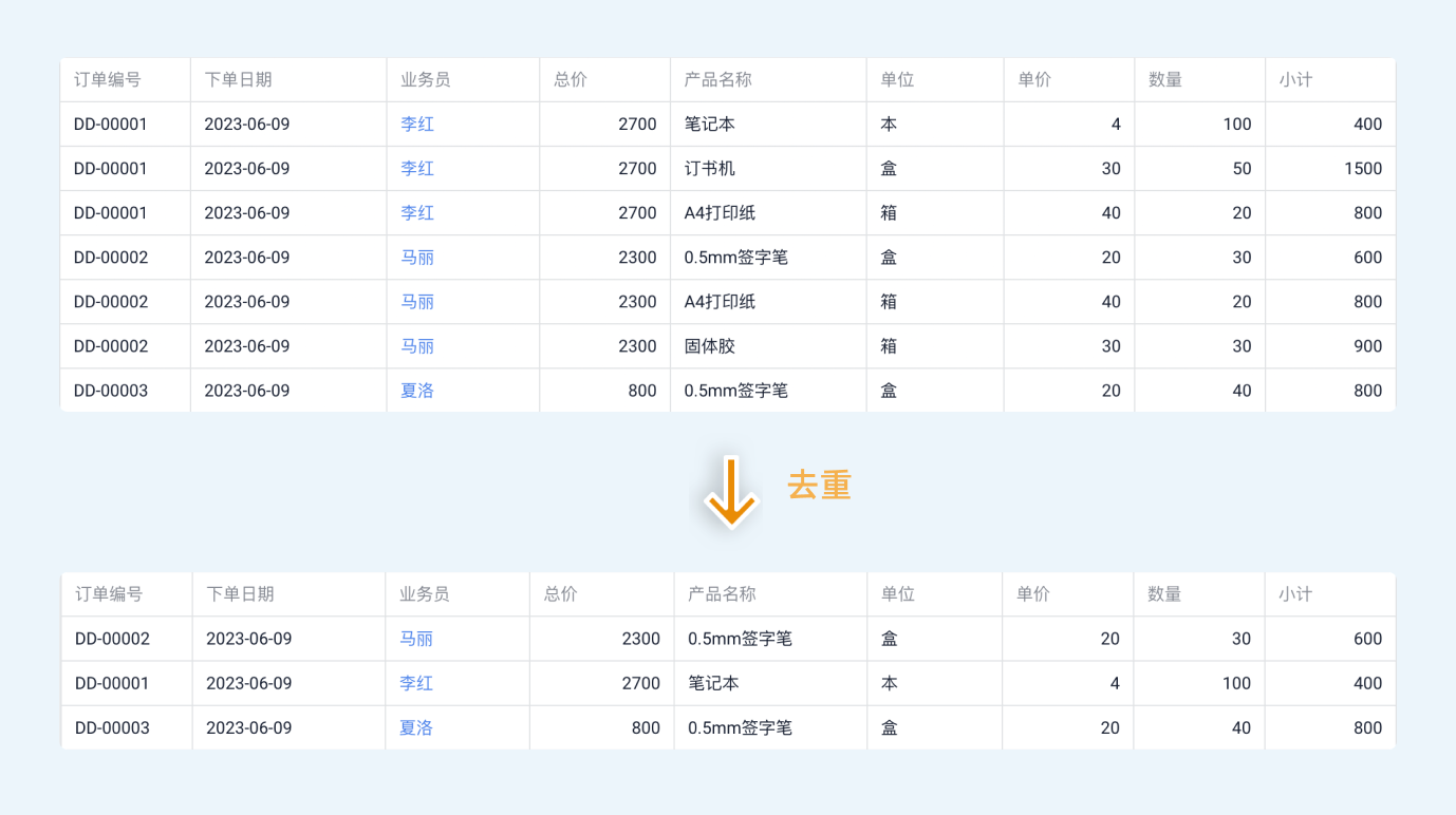 例如,根据订单编号去重,相同订单编号的数据仅保留一条,便于后续对订单总金额进行计算。