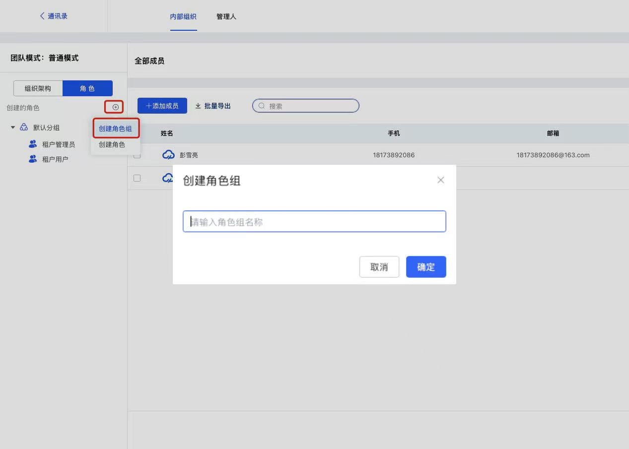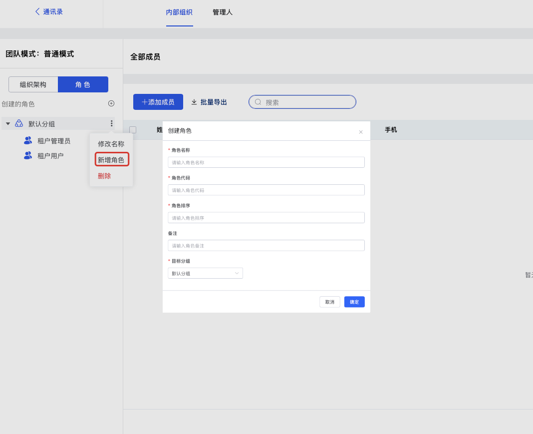 在创建角色前,需要创建角色组。在 通讯录 中进行创建,如下图所示: