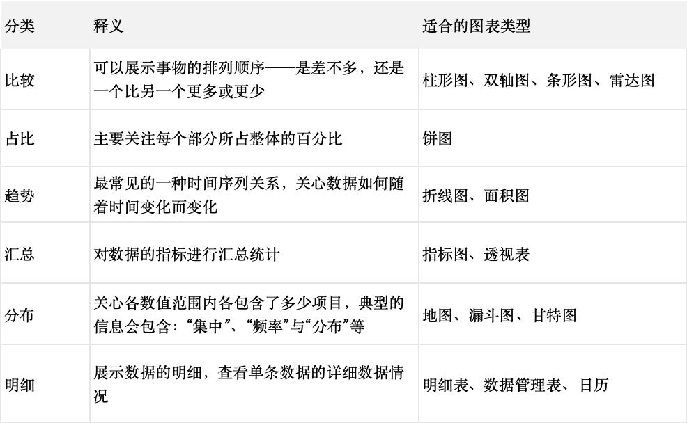 本文将图表分成几个大类,分别为「比较类、占比类、趋势或关联类、分布类以及明细类」,用户可根据自己的目的选择适合的图表。